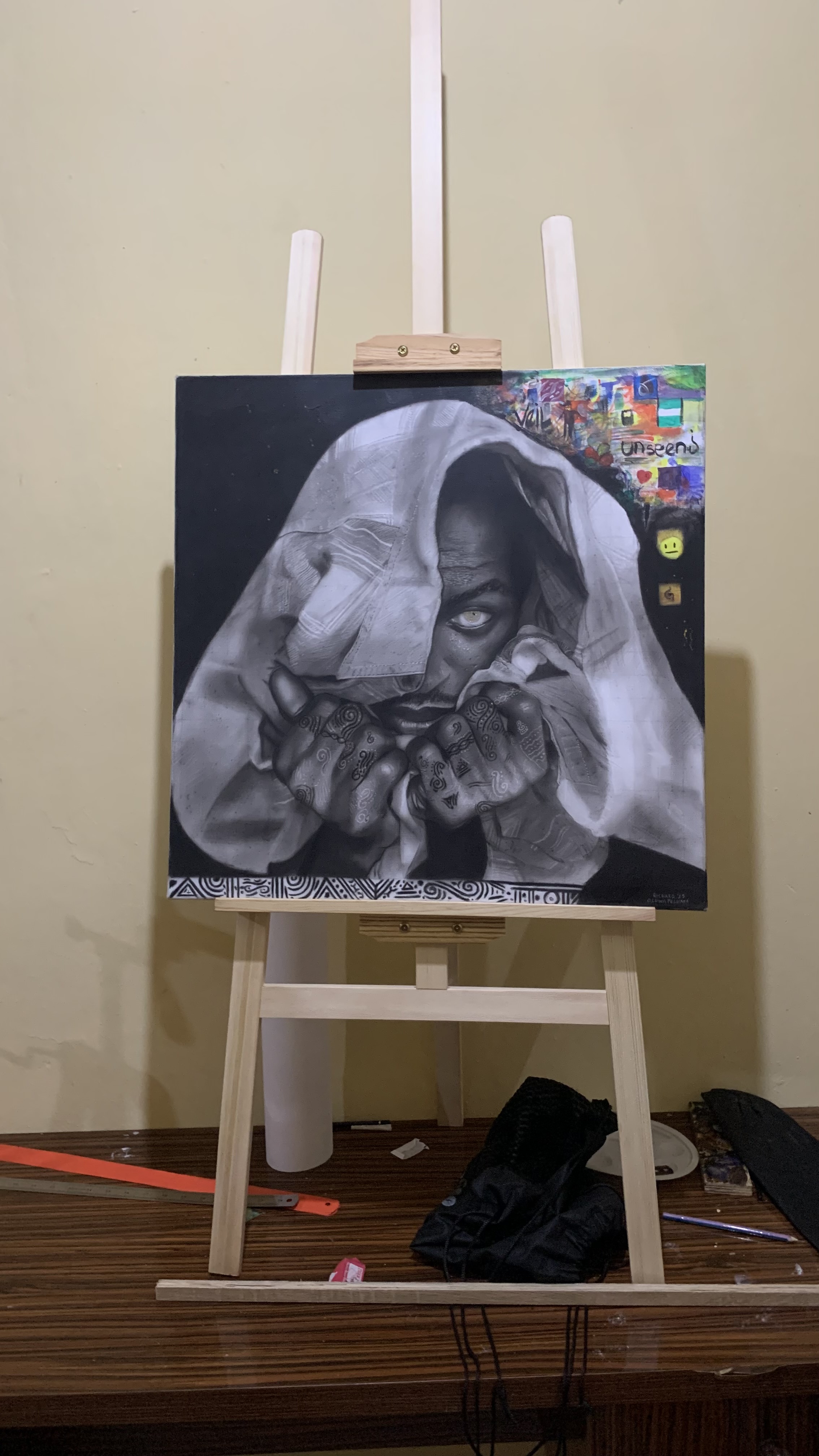 Oluwapelumi Richard Ilesanmi (b. 1999, Lagos, Nigeria) is a self-taught visual artist whose practice is rooted in charcoal drawing. His works explore themes of memory, identity, and the human condition, often rendered with a striking hyperrealism that emphasizes both vulnerability and resilience. By working in monochrome, he creates powerful contrasts of light and shadow that capture not only physical likeness but also the unspoken emotions and layered narratives of his subjects.